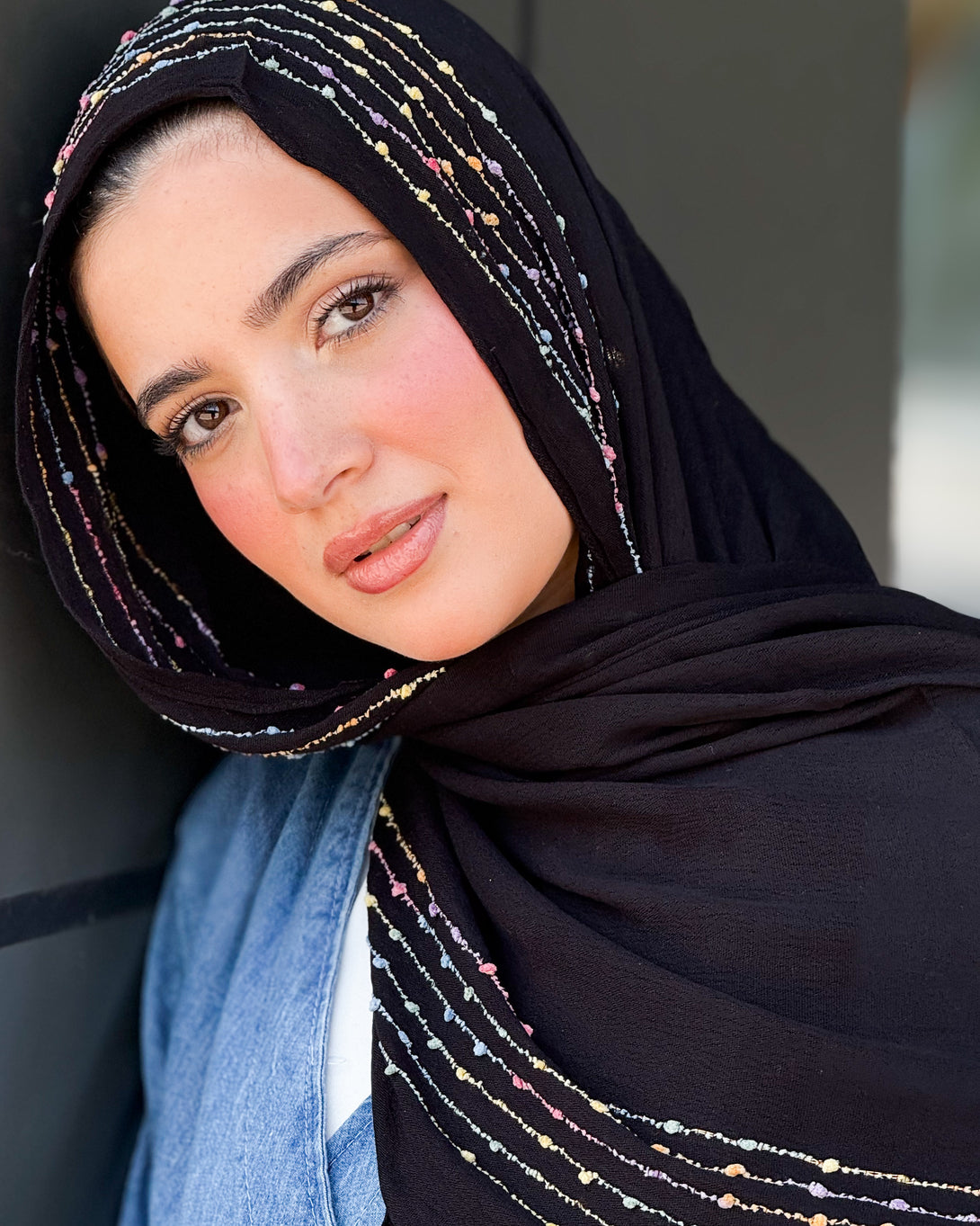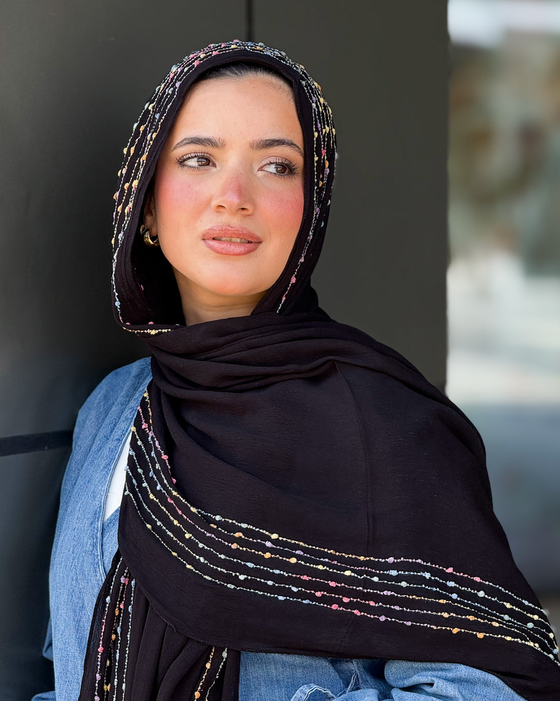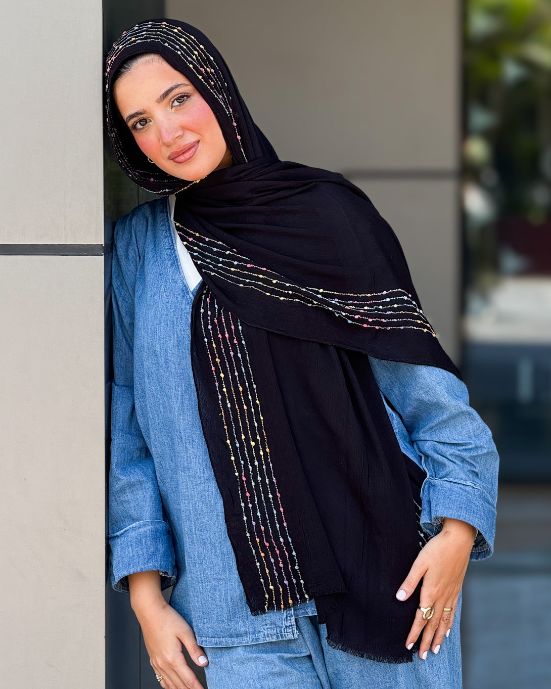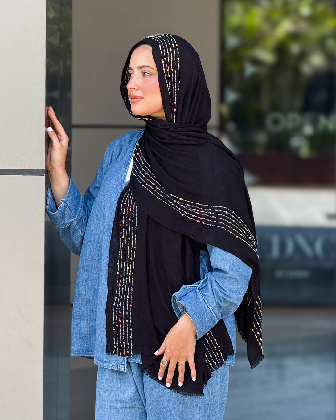 Elevate your everyday look with the Twist of Lines Hijab, featuring delicate hand-made stitched lines that add a modern, chic touch. Designed in a generous size of 190 cm length × 68 cm width, it offers versatile styling options and full coverage.
